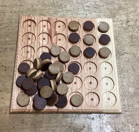 | 製品説明 | ボール盤でつけた溝を組んで、盤を作りました。コマは両面に着色してから接着し、蜜ロウワックスで仕上げました。手触りのよい木のリバーシで、いざ、勝負。 |